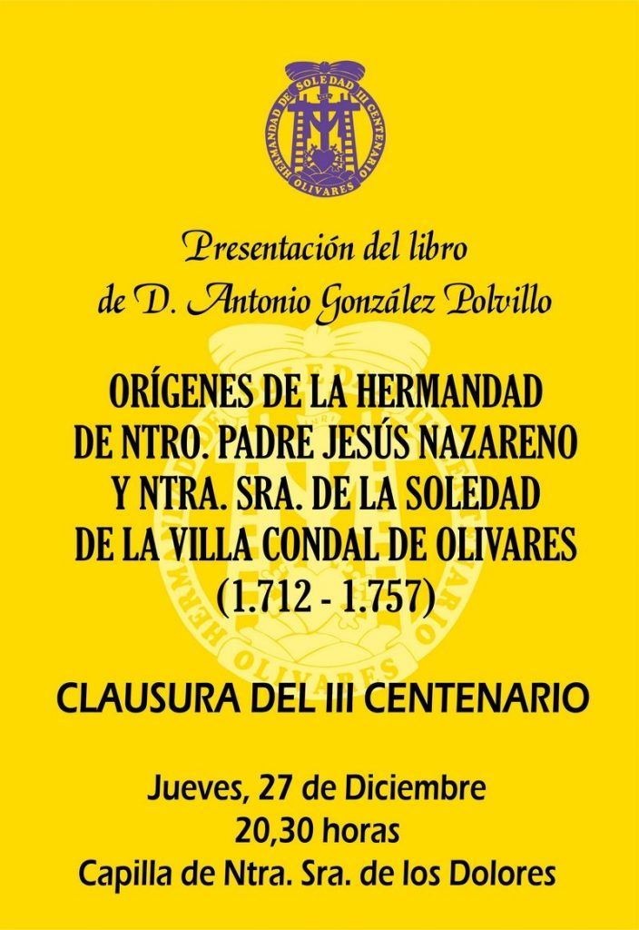 PRESENTACIÓN DEL LIBRO “ORÍGENES DE LA HERMANDAD DE NUESTRO PADRE JESÚS NAZARENO Y NUESTRA SEÑORA DE LA SOLEDAD DE LA VILLA CONDAL DE OLIVARES (1712-1757)”